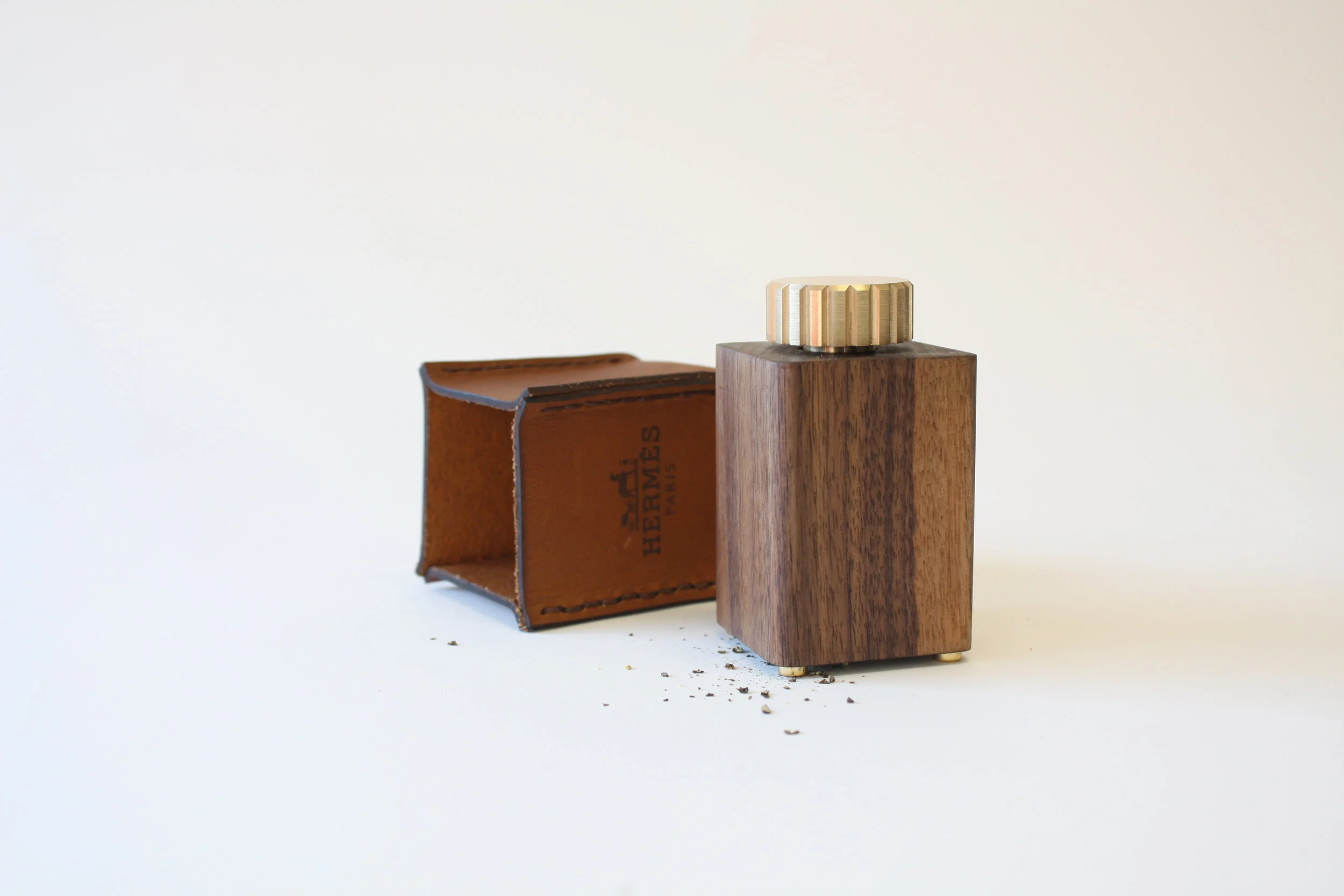 The pepper over time, infuses it’s aroma into the leather, just as the oil from the users skin interacts with the case, making each piece distinctive to its owner.
